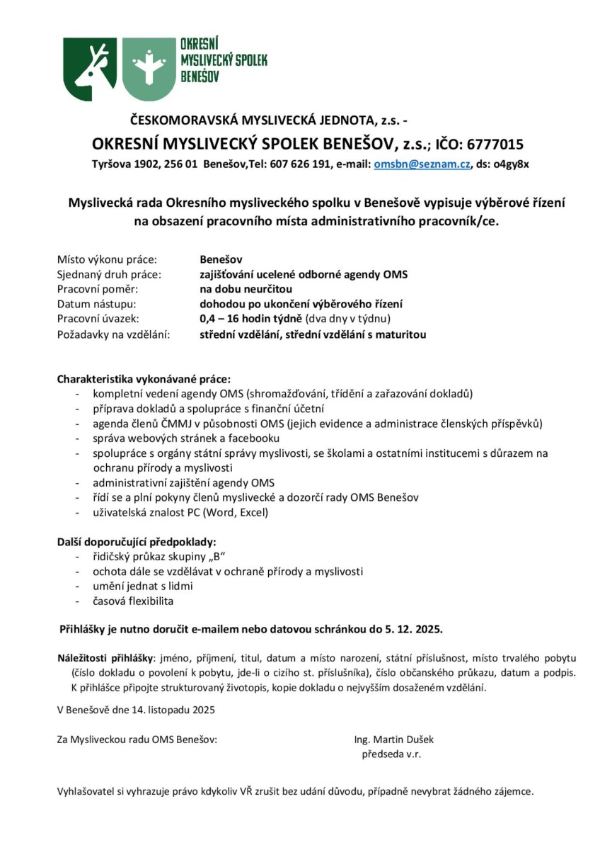 Myslivecká rada Okresního mysliveckého spolku v Benešově vypisuje výběrové řízení
